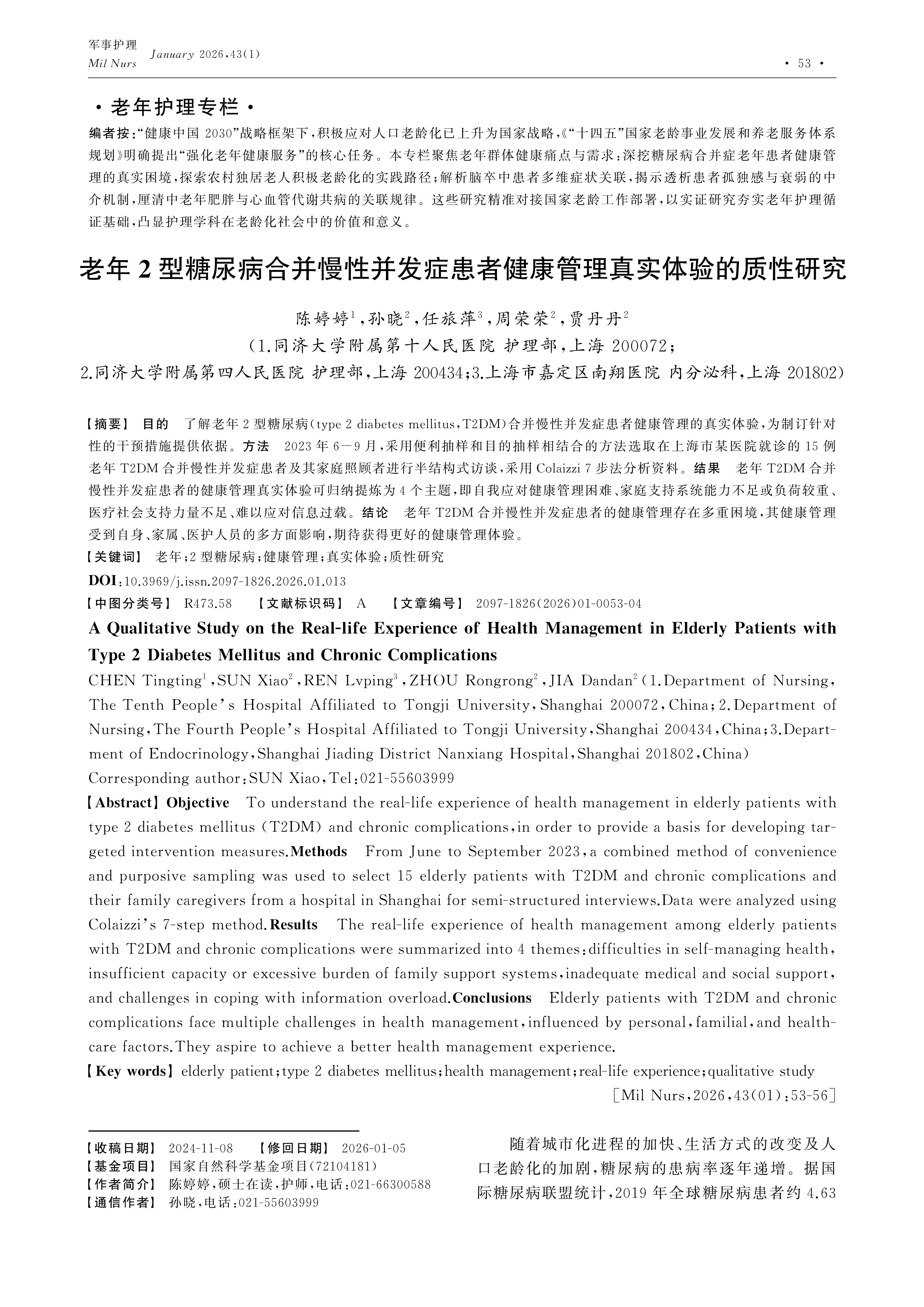 目的 了解老年2型糖尿病(type 2 diabetes mellitus,T2DM)合并慢性并发症患者健康管理的真实体验,为制订针对性的干预措施提供依据。方法 2023年6-9月,采用便利抽样和目的抽样相结合的方法选取在上海市某医院就诊的15例老年T2DM合并慢性并发症患者及其家庭照顾者进行半结构式访谈,采用Colaizzi 7步法分析资料。结果 老年T2DM合并慢性并发症患者的健康管理真实体验可归纳提炼为4个主题,即自我应对健康管理困难、家庭支持系统能力不足或负荷较重、医疗社会支持力量不足、难以应对信息过载。结论 老年T2DM合并慢性并发症患者的健康管理存在多重困境,其健康管理受到自身、家属、医护人员的多方面影响,期待获得更好的健康管理体验。