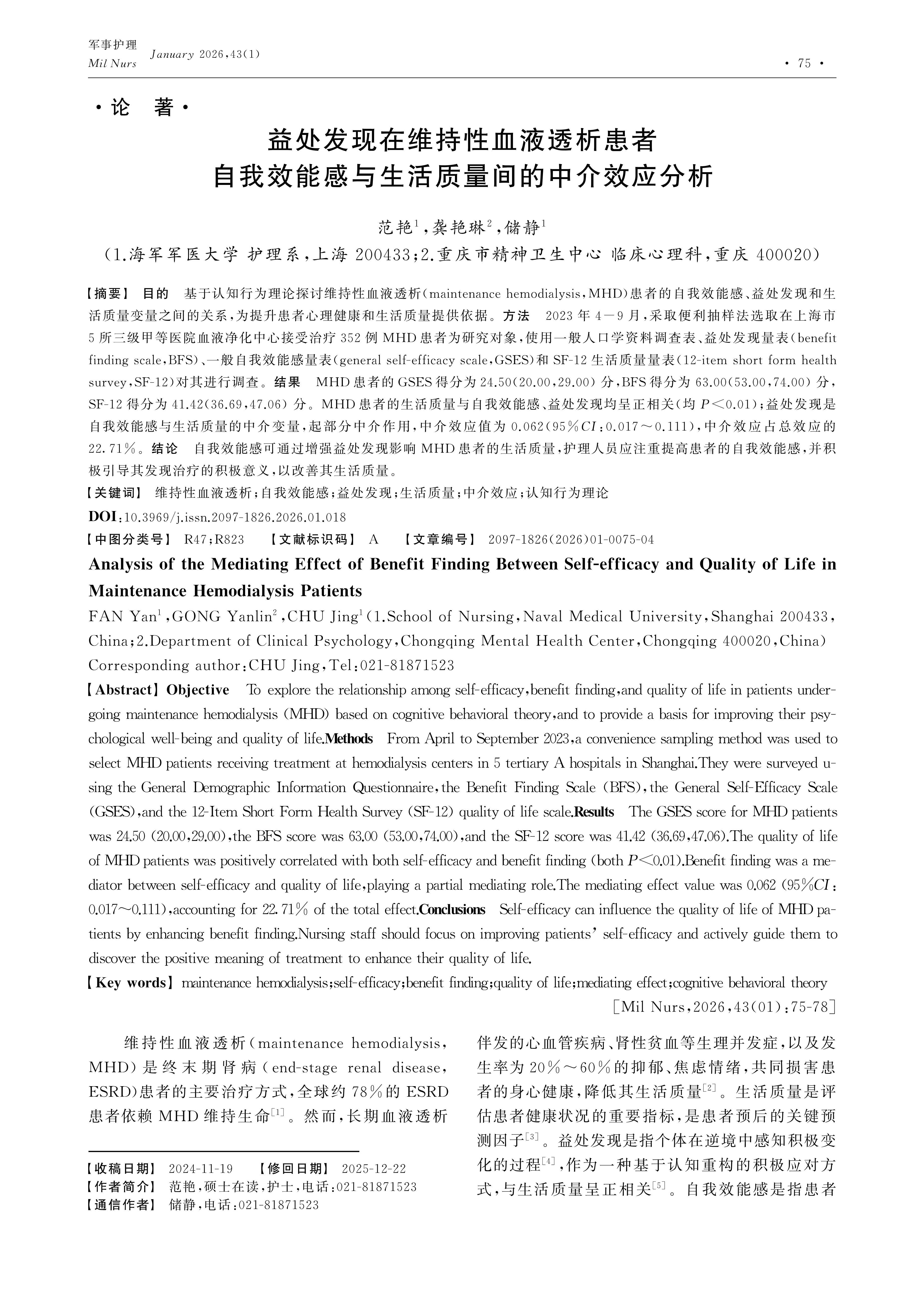 目的 基于认知行为理论探讨维持性血液透析(maintenance hemodialysis,MHD)患者的自我效能感、益处发现和生活质量变量之间的关系,为提升患者心理健康和生活质量提供依据。方法 2023年4-9月,采取便利抽样法选取在上海市5所三级甲等医院血液净化中心接受治疗352例MHD患者为研究对象,使用一般人口学资料调查表、益处发现量表(benefit finding scale,BFS)、一般自我效能感量表(general self-efficacy scale,GSES)和SF-12生活质量量表(12-item short form health survey,SF-12)对其进行调查。结果 MHD患者的GSES得分为24.50(20.00,29.00) 分,BFS得分为 63.00(53.00,74.00) 分,SF-12得分为41.42(36.69,47.06) 分。MHD患者的生活质量与自我效能感、益处发现均呈正相关(均P<0.01);益处发现是自我效能感与生活质量的中介变量,起部分中介作用,中介效应值为0.062(95%CI:0.017~0.111),中介效应占总效应的22.71%。结论 自我效能感可通过增强益处发现影响MHD患者的生活质量,护理人员应注重提高患者的自我效能感,并积极引导其发现治疗的积极意义,以改善其生活质量。