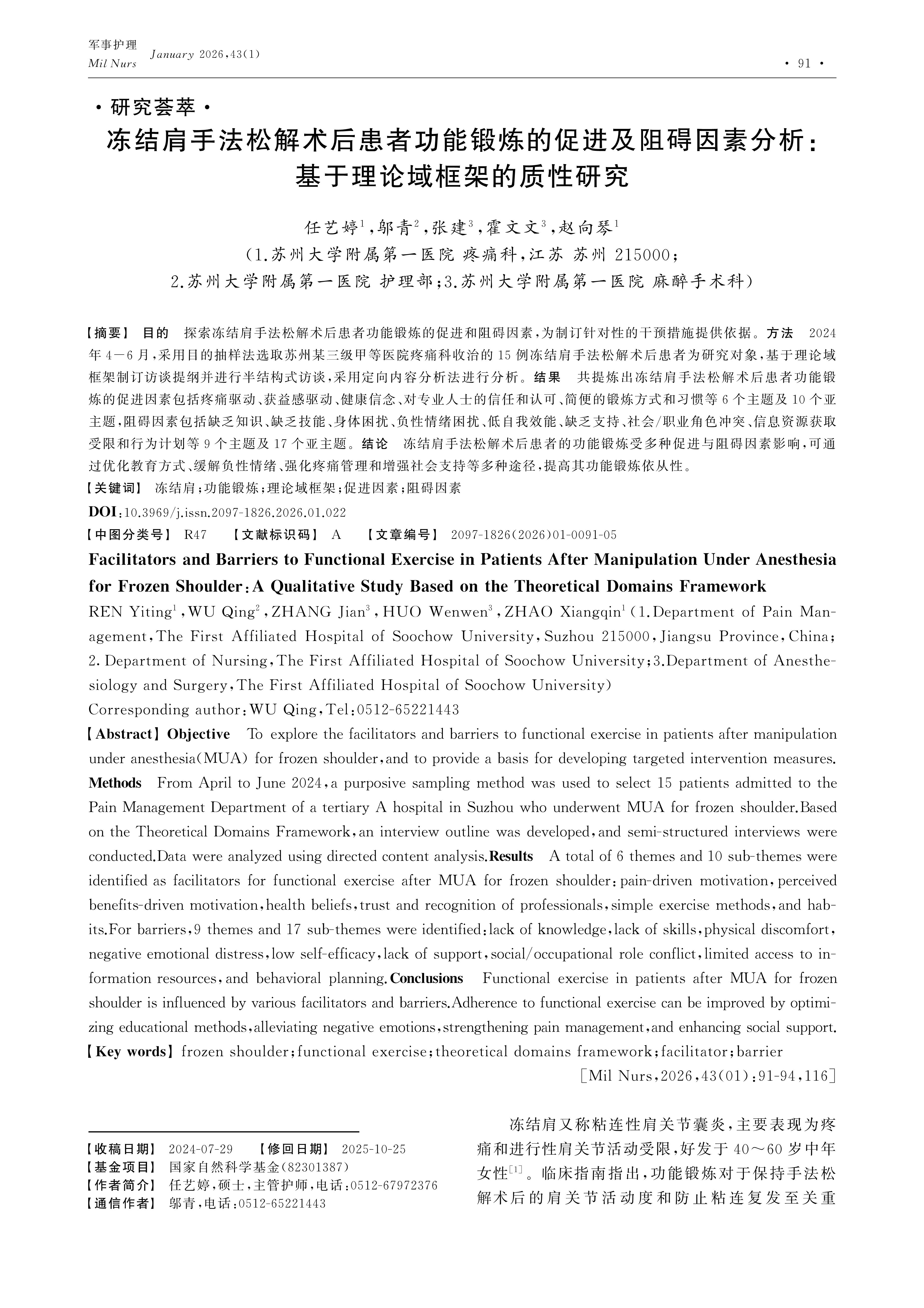 Objective To explore the facilitators and barriers to functional exercise in patients after manipulation under anesthesia(MUA) for frozen shoulder,and to provide a basis for developing targeted intervention measures.Methods From April to June 2024,a purposive sampling method was used to select 15 patients admitted to the Pain Management Department of a tertiary A hospital in Suzhou who underwent MUA for frozen shoulder.Based on the Theoretical Domains Framework,an interview outline was developed,and semi-structured interviews were conducted.Data were analyzed using directed content analysis.Results A total of 6 themes and 10 sub-themes were identified as facilitators for functional exercise after MUA for frozen shoulder:pain-driven motivation,perceived benefits-driven motivation,health beliefs,trust and recognition of professionals,simple exercise methods,and habits.For barriers,9 themes and 17 sub-themes were identified:lack of knowledge,lack of skills,physical discomfort,negative emotional distress,low self-efficacy,lack of support,social/occupational role conflict,limited access to information resources,and behavioral planning.Conclusions Functional exercise in patients after MUA for frozen shoulder is influenced by various facilitators and barriers.Adherence to functional exercise can be improved by optimizing educational methods,alleviating negative emotions,strengthening pain management,and enhancing social support.