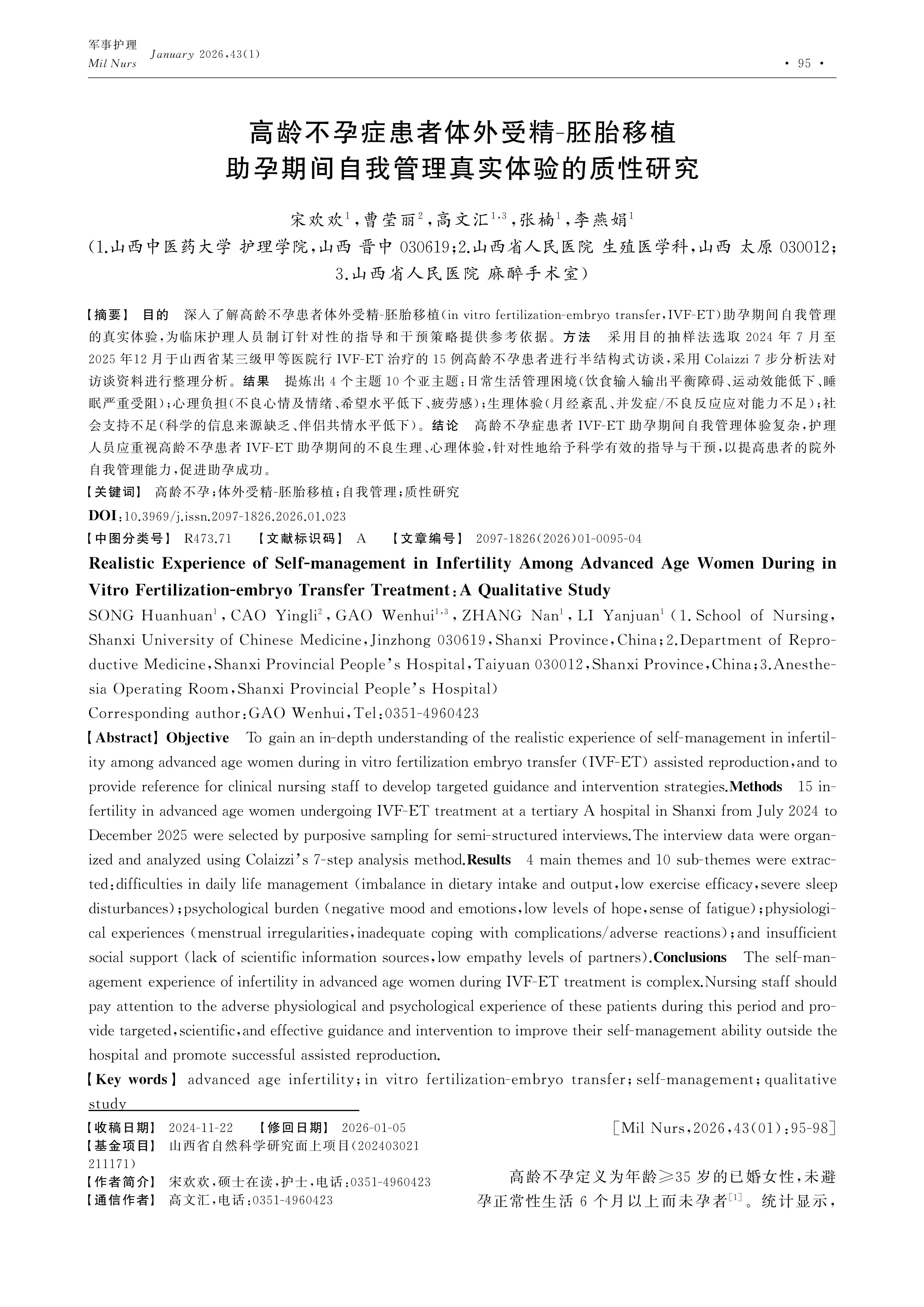 Objective To gain an in-depth understanding of the realistic experience of self-management in infertility among advanced age women during in vitro fertilization embryo transfer (IVF-ET) assisted reproduction,and to provide reference for clinical nursing staff to develop targeted guidance and intervention strategies.Methods 15 infertility in advanced age women undergoing IVF-ET treatment at a tertiary A hospital in Shanxi from July 2024 to December 2025 were selected by purposive sampling for semi-structured interviews.The interview data were organized and analyzed using Colaizzi’s 7-step analysis method.Results 4 main themes and 10 sub-themes were extracted:difficulties in daily life management (imbalance in dietary intake and output,low exercise efficacy,severe sleep disturbances);psychological burden (negative mood and emotions,low levels of hope,sense of fatigue);physiological experiences (menstrual irregularities,inadequate coping with complications/adverse reactions);and insufficient social support (lack of scientific information sources,low empathy levels of partners).Conclusions The self-management experience of infertility in advanced age women during IVF-ET treatment is complex.Nursing staff should pay attention to the adverse physiological and psychological experience of these patients during this period and provide targeted,scientific,and effective guidance and intervention to improve their self-management ability outside the hospital and promote successful assisted reproduction.
