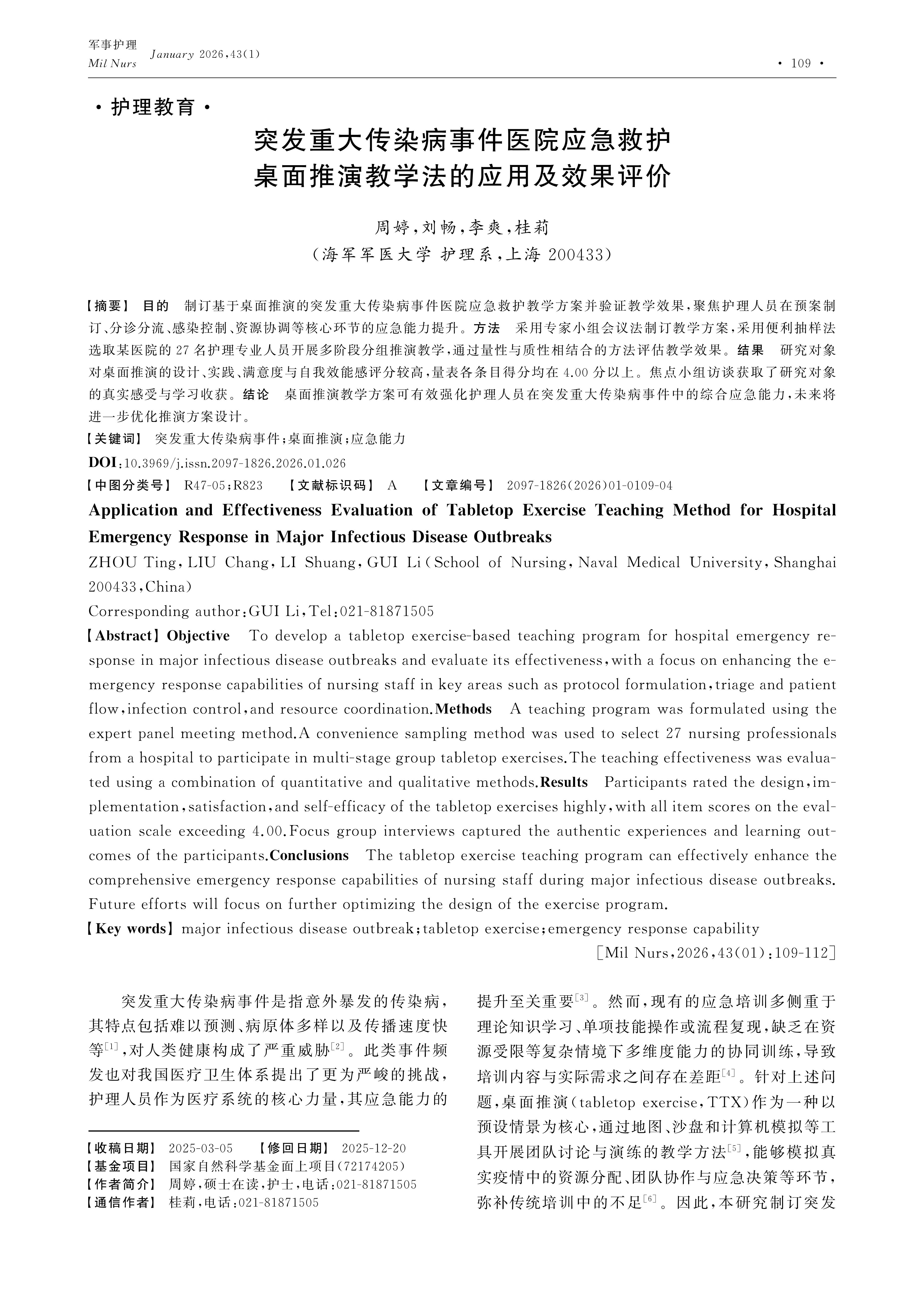 Objective To develop a tabletop exercise-based teaching program for hospital emergency response in major infectious disease outbreaks and evaluate its effectiveness,with a focus on enhancing the emergency response capabilities of nursing staff in key areas such as protocol formulation,triage and patient flow,infection control,and resource coordination.Methods A teaching program was formulated using the expert panel meeting method.A convenience sampling method was used to select 27 nursing professionals from a hospital to participate in multi-stage group tabletop exercises.The teaching effectiveness was evaluated using a combination of quantitative and qualitative methods.Results Participants rated the design,implementation,satisfaction,and self-efficacy of the tabletop exercises highly,with all item scores on the evaluation scale exceeding 4.00.Focus group interviews captured the authentic experiences and learning outcomes of the participants.Conclusions The tabletop exercise teaching program can effectively enhance the comprehensive emergency response capabilities of nursing staff during major infectious disease outbreaks.Future efforts will focus on further optimizing the design of the exercise program.
