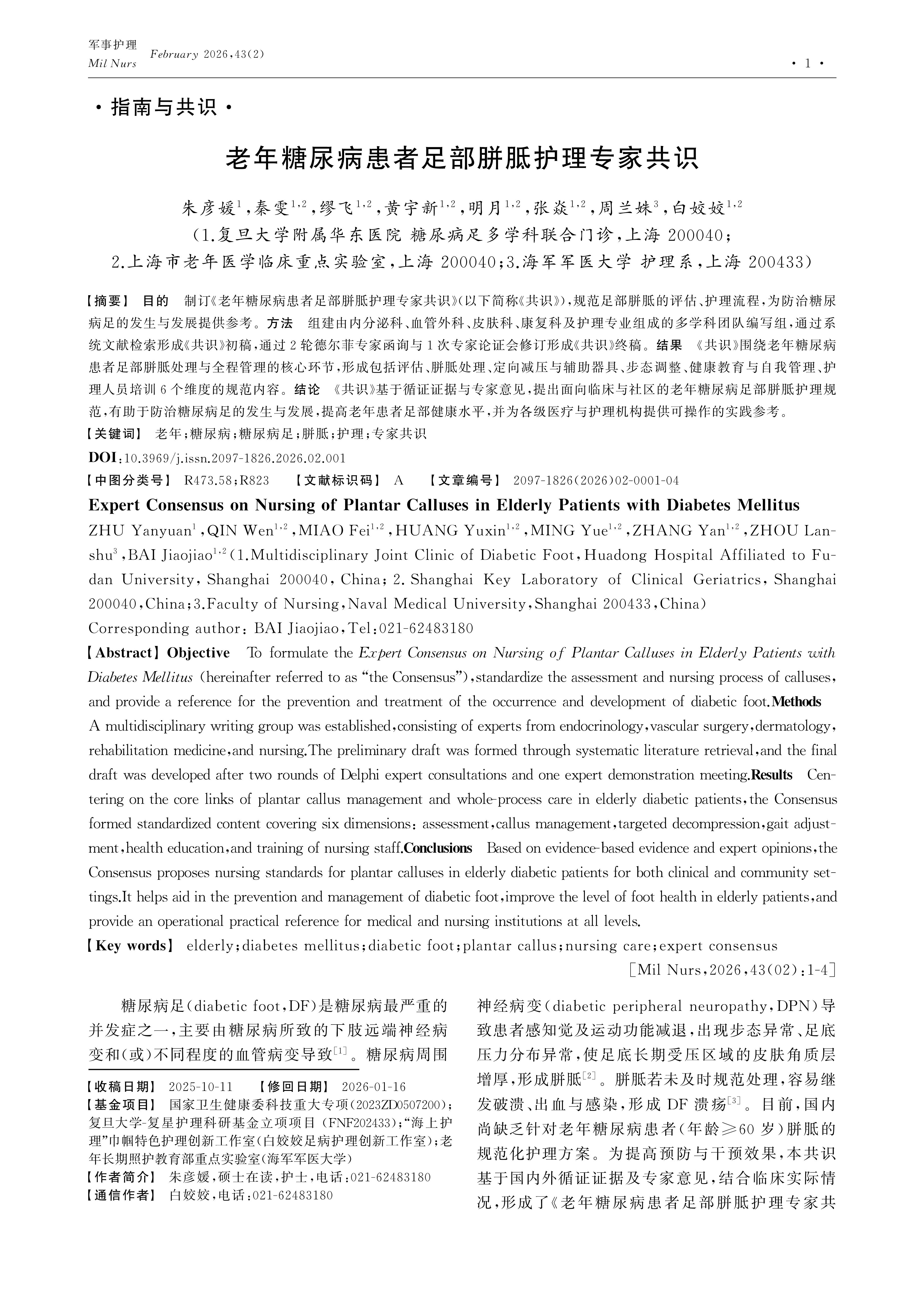 国家卫生健康委科技重大专项(2023ZD0507200);复旦大学-复星护理科研基金立项项目 (FNF202433);“海上护理”巾帼特色护理创新工作室(白姣姣足病护理创新工作室);老年长期照护教育部重点实验室(海军军医大学)