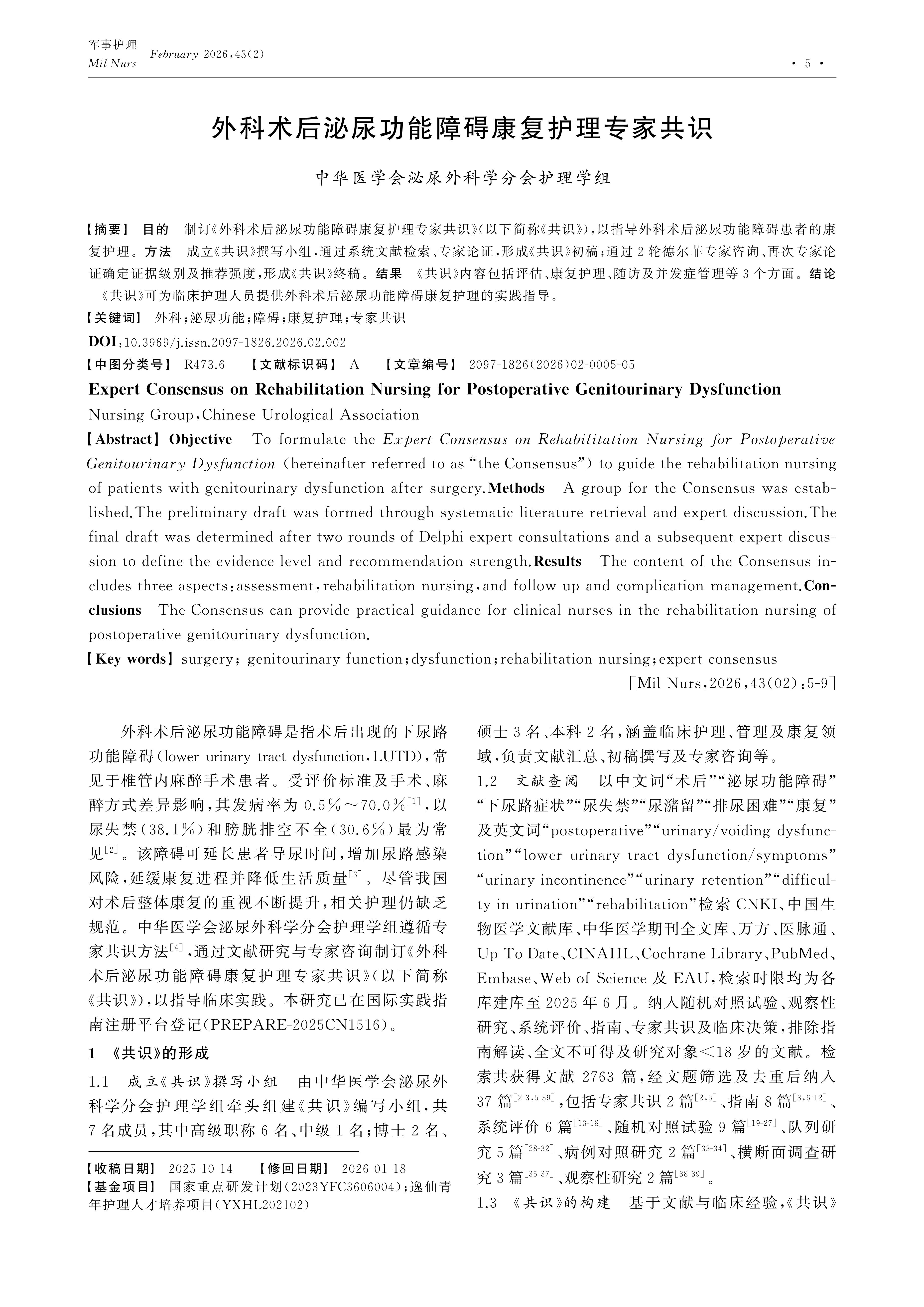 ObjectiveTo formulate theExpert Consensus on Rehabilitation Nursing for Postoperative Genitourinary Dysfunction(hereinafter referred to as “the Consensus”) to guide the rehabilitation nursing of patients with genitourinary dysfunction after surgery.Methods A group for the Consensus was established.The preliminary draft was formed through systematic literature retrieval and expert discussion.The final draft was determined after two rounds of Delphi expert consultations and a subsequent expert discussion to define the evidence level and recommendation strength.ResultsThe content of the Consensus includes three aspects:assessment,rehabilitation nursing,and follow-up and complication management. ConclusionsThe Consensus can provide practical guidance for clinical nurses in the rehabilitation nursing of postoperative genitourinary dysfunction.