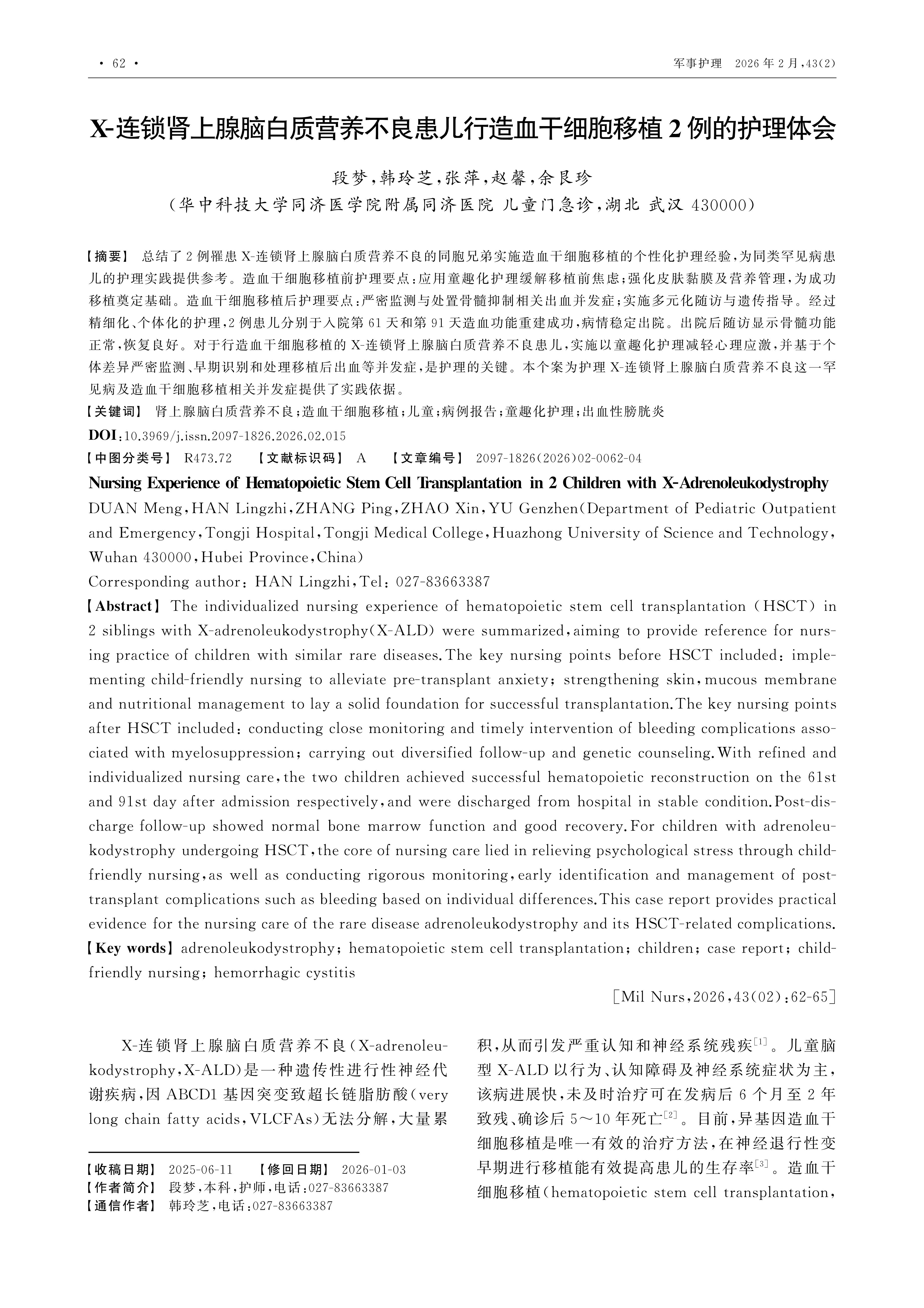 总结了2例罹患X-连锁肾上腺脑白质营养不良的同胞兄弟实施造血干细胞移植的个性化护理经验,为同类罕见病患儿的护理实践提供参考。造血干细胞移植前护理要点:应用童趣化护理缓解移植前焦虑;强化皮肤黏膜及营养管理,为成功移植奠定基础。造血干细胞移植后护理要点:严密监测与处置骨髓抑制相关出血并发症;实施多元化随访与遗传指导。经过精细化、个体化的护理,2例患儿分别于入院第61天和第91天造血功能重建成功,病情稳定出院。出院后随访显示骨髓功能正常,恢复良好。对于行造血干细胞移植的X-连锁肾上腺脑白质营养不良患儿,实施以童趣化护理减轻心理应激,并基于个体差异严密监测、早期识别和处理移植后出血等并发症,是护理的关键。本个案为护理X-连锁肾上腺脑白质营养不良这一罕见病及造血干细胞移植相关并发症提供了实践依据。