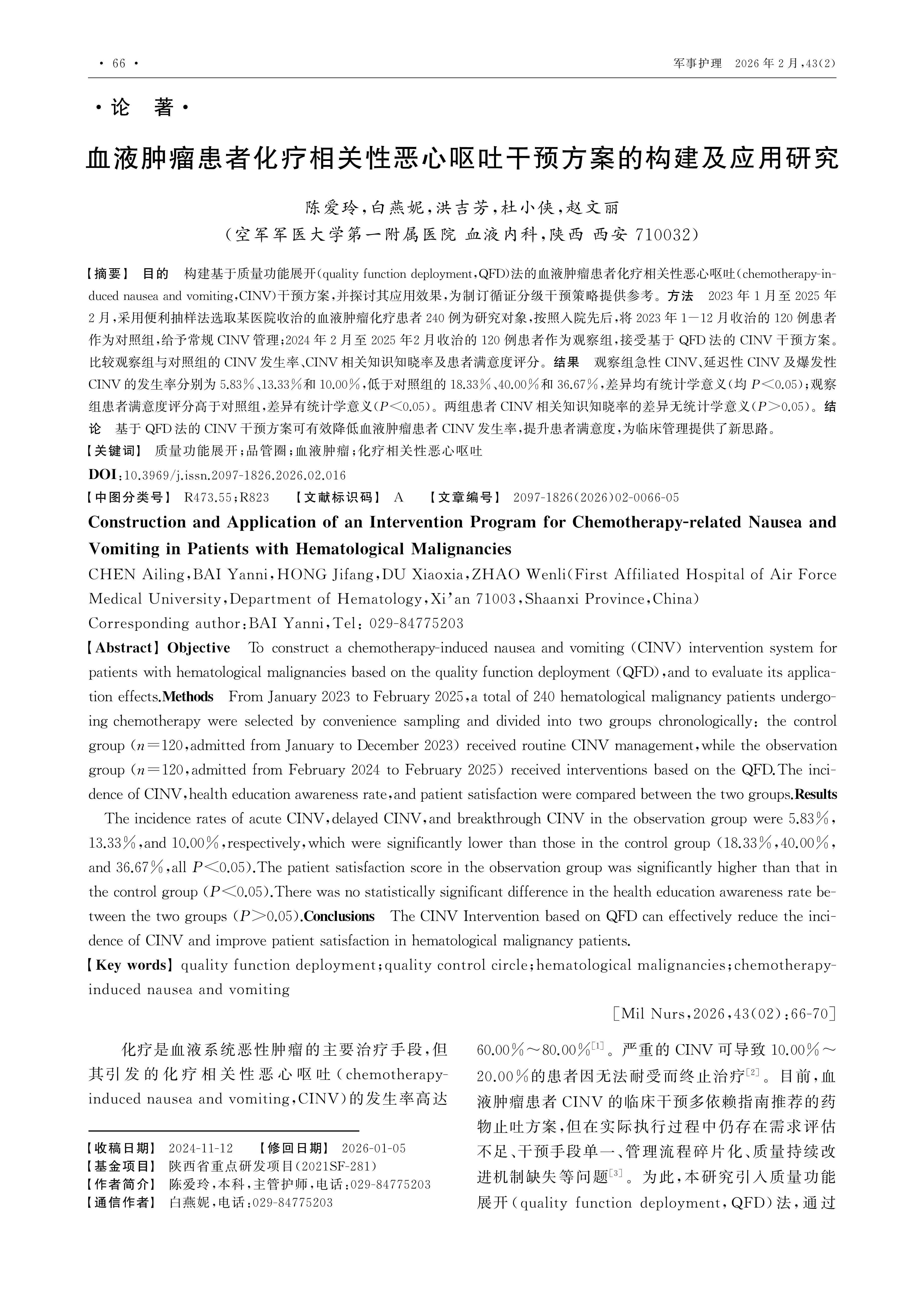 Objective To construct a chemotherapy-induced nausea and vomiting (CINV) intervention system for patients with hematological malignancies based on the quality function deployment (QFD),and to evaluate its application effects.Methods From January 2023 to February 2025,a total of 240 hematological malignancy patients undergoing chemotherapy were selected by convenience sampling and divided into two groups chronologically: the control group ( n =120,admitted from January to December 2023) received routine CINV management,while the observation group ( n =120,admitted from February 2024 to February 2025) received interventions based on the QFD.The incidence of CINV,health education awareness rate,and patient satisfaction were compared between the two groups.Results The incidence rates of acute CINV,delayed CINV,and breakthrough CINV in the observation group were 5.83%,13.33%,and 10.00%,respectively,which were significantly lower than those in the control group (18.33%,40.00%,and 36.67%,all P <0.05).The patient satisfaction score in the observation group was significantly higher than that in the control group ( P <0.05).There was no statistically significant difference in the health education awareness rate between the two groups ( P >0.05). Conclusions The CINV Intervention based on QFD can effectively reduce the incidence of CINV and improve patient satisfaction in hematological malignancy patients.