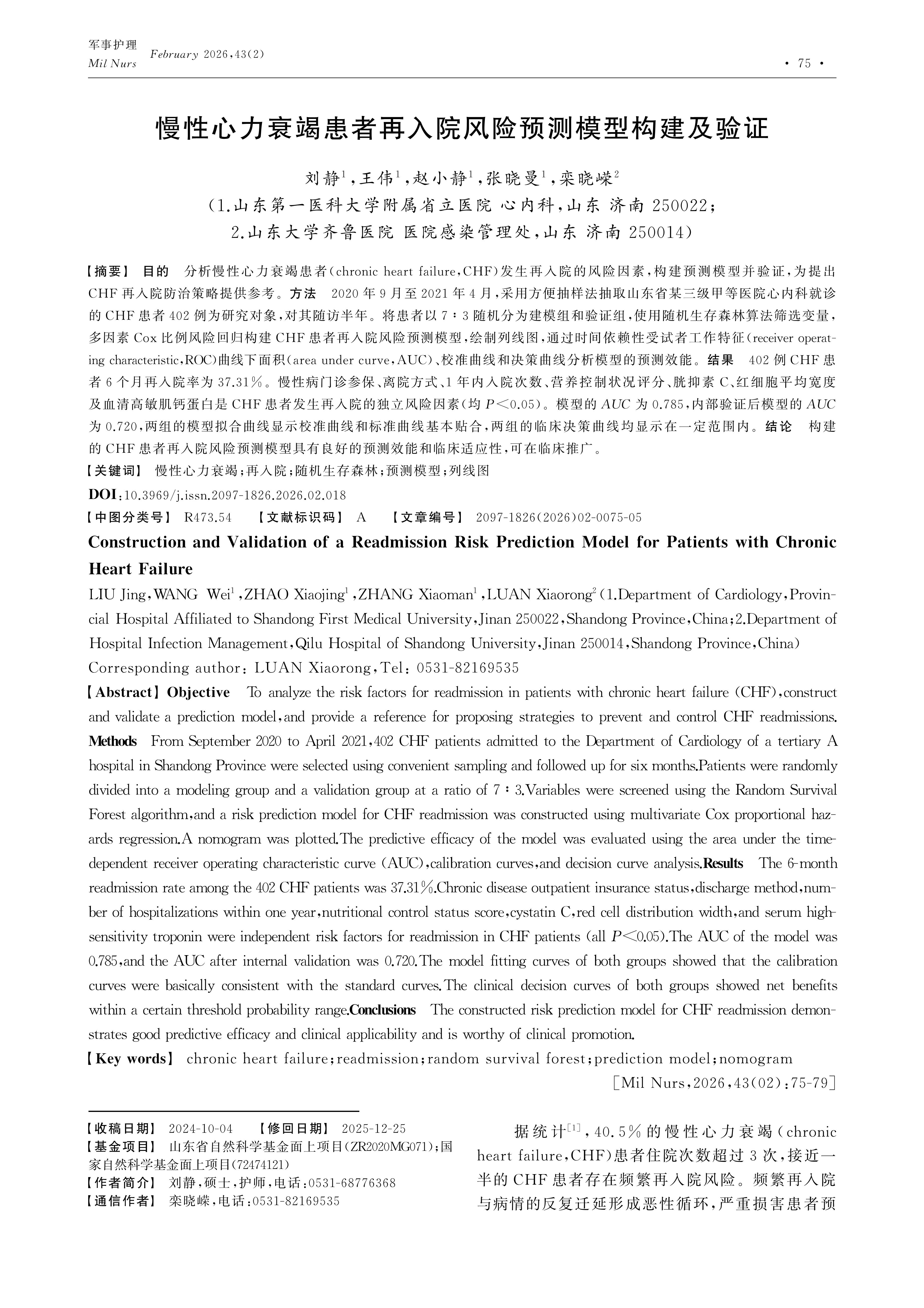 目的 分析慢性心力衰竭患者(chronic heart failure,CHF)发生再入院的风险因素,构建预测模型并验证,为提出CHF再入院防治策略提供参考。方法 2020年9月至2021年4月,采用方便抽样法抽取山东省某三级甲等医院心内科就诊的CHF患者402例为研究对象,对其随访半年。将患者以7∶3随机分为建模组和验证组,使用随机生存森林算法筛选变量,多因素Cox比例风险回归构建CHF患者再入院风险预测模型,绘制列线图,通过时间依赖性受试者工作特征(receiver operating characteristic,ROC)曲线下面积(area under curve,AUC)、校准曲线和决策曲线分析模型的预测效能。结果 402例CHF患者6个月再入院率为37.31%。慢性病门诊参保、离院方式、1年内入院次数、营养控制状况评分、胱抑素C、红细胞平均宽度及血清高敏肌钙蛋白是CHF患者发生再入院的独立风险因素(均 P <0.05)。模型的 AUC 为0.785,内部验证后模型的 AUC 为0.720,两组的模型拟合曲线显示校准曲线和标准曲线基本贴合,两组的临床决策曲线均显示在一定范围内。结论 构建的CHF患者再入院风险预测模型具有良好的预测效能和临床适应性,可在临床推广。