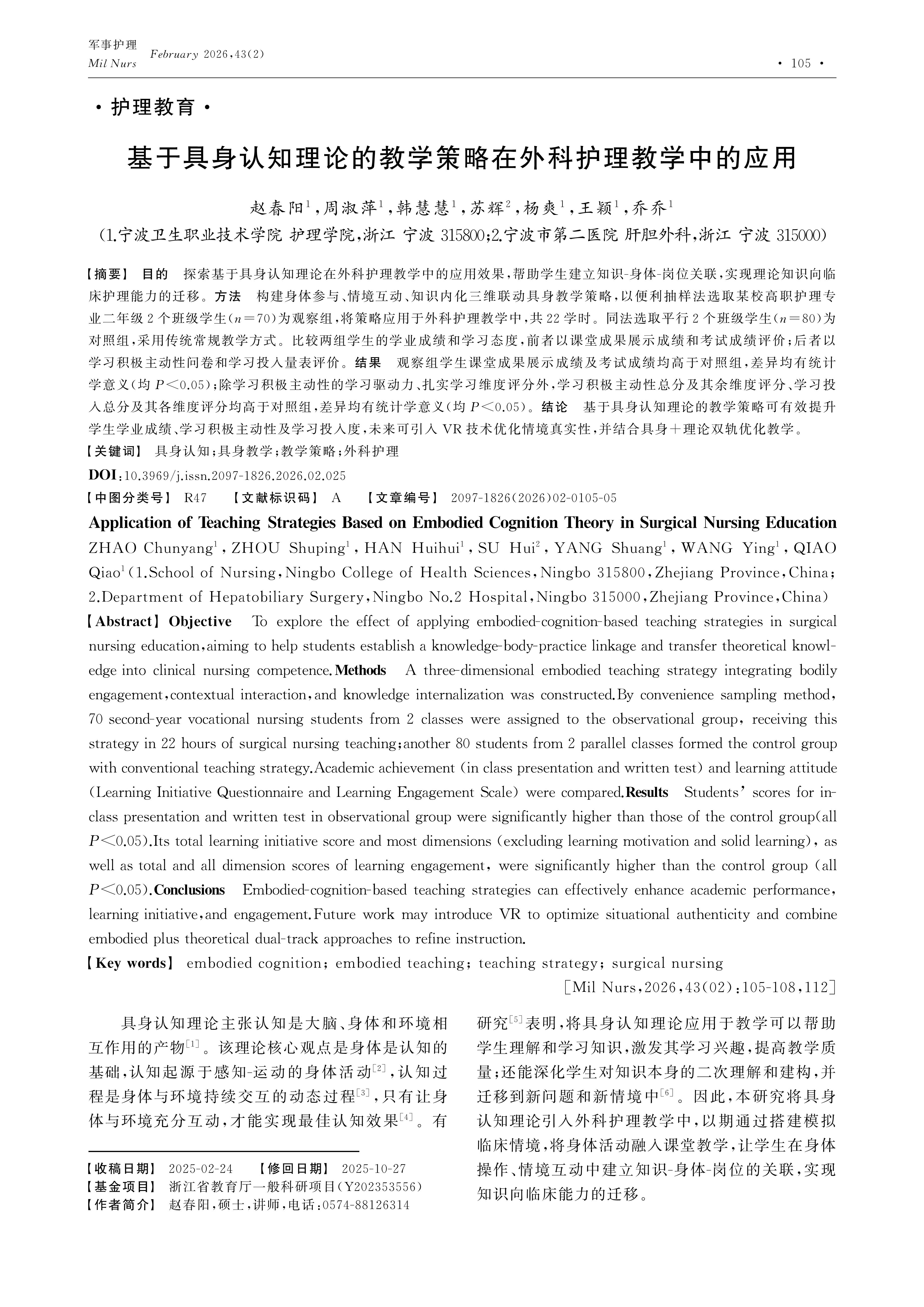Objective To explore the effect of applying embodied-cognition-based teaching strategies in surgical nursing education,aiming to help students establish a knowledge-body-practice linkage and transfer theoretical knowledge into clinical nursing competence.Methods A three-dimensional embodied teaching strategy integrating bodily engagement,contextual interaction,and knowledge internalization was constructed.By convenience sampling method,70 second-year vocational nursing students from 2 classes were assigned to the observational group, receiving this strategy in 22 hours of surgical nursing teaching;another 80 students from 2 parallel classes formed the control group with conventional teaching strategy.Academic achievement (in class presentation and written test) and learning attitude (Learning Initiative Questionnaire and Learning Engagement Scale) were compared.Results Students’ scores for in-class presentation and written test inobservational group were significantly higher than those of the control group(all P <0.05).Its total learning initiative score and most dimensions (excluding learning motivation and solid learning), as well as total and all dimension scores of learning engagement, were significantly higher than the control group (all P <0.05). Conclusions Embodied-cognition-based teaching strategies can effectively enhance academic performance,learning initiative,and engagement.Future work may introduce VR to optimize situational authenticity and combine embodied plus theoretical dual-track approaches to refine instruction.