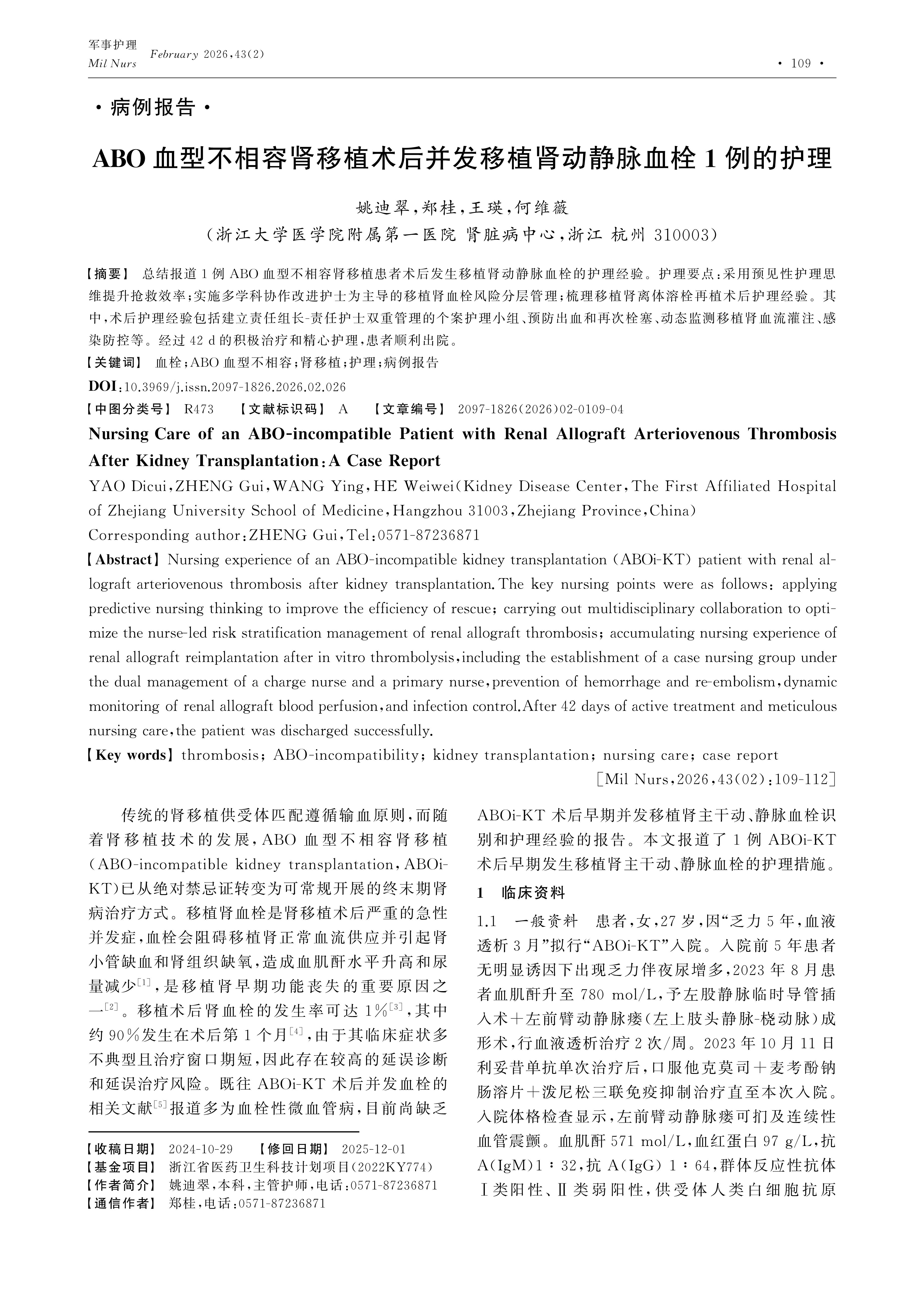 Nursing experience of an ABO-incompatible kidney transplantation (ABOi-KT) patient with renal allograft arteriovenous thrombosis after kidney transplantation.The key nursing points were as follows: applying predictive nursing thinking to improve the efficiency of rescue; carrying out multidisciplinary collaboration to optimize the nurse-led risk stratification management of renal allograft thrombosis; accumulating nursing experience of renal allograft reimplantation after in vitro thrombolysis,including the establishment of a case nursing group under the dual management of a charge nurse and a primary nurse,prevention of hemorrhage and re-embolism,dynamic monitoring of renal allograft blood perfusion,and infection control.After 42 days of active treatment and meticulous nursing care,the patient was discharged successfully.
