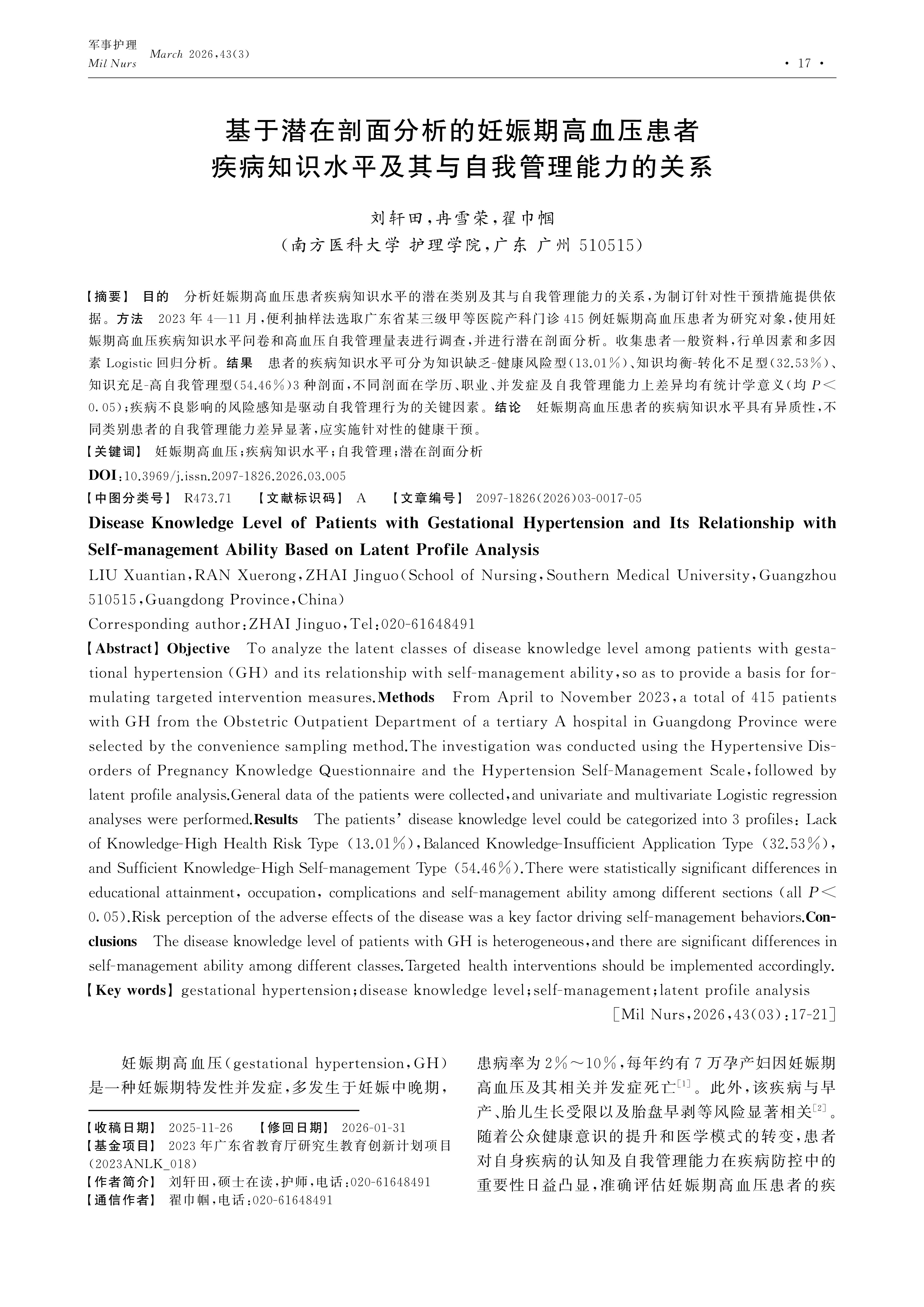Objective To analyze the latent classes of disease knowledge level among patients with gestational hypertension (GH) and its relationship with self-management ability,so as to provide a basis for formulating targeted intervention measures.Methods From April to November 2023,a total of 415 patients with GH from the Obstetric Outpatient Department of a tertiary A hospital in Guangdong Province were selected by the convenience sampling method.The investigation was conducted using the Hypertensive Disorders of Pregnancy Knowledge Questionnaire and the Hypertension Self-Management Scale,followed by latent profile analysis.General data of the patients were collected,and univariate and multivariate Logistic regression analyses were performed.Results The patients’ disease knowledge level could be categorized into 3 profiles: Lack of Knowledge-High Health Risk Type (13.01%),Balanced Knowledge-Insufficient Application Type (32.53%),and Sufficient Knowledge-High Self-management Type (54.46%).There were statistically significant differences in educational attainment, occupation, complications and self-management ability among different sections (all P<0.05).Risk perception of the adverse effects of the disease was a key factor driving self-management behaviors.Conclusions The disease knowledge level of patients with GH is heterogeneous,and there are significant differences in self-management ability among different classes.Targeted health interventions should be implemented accordingly.