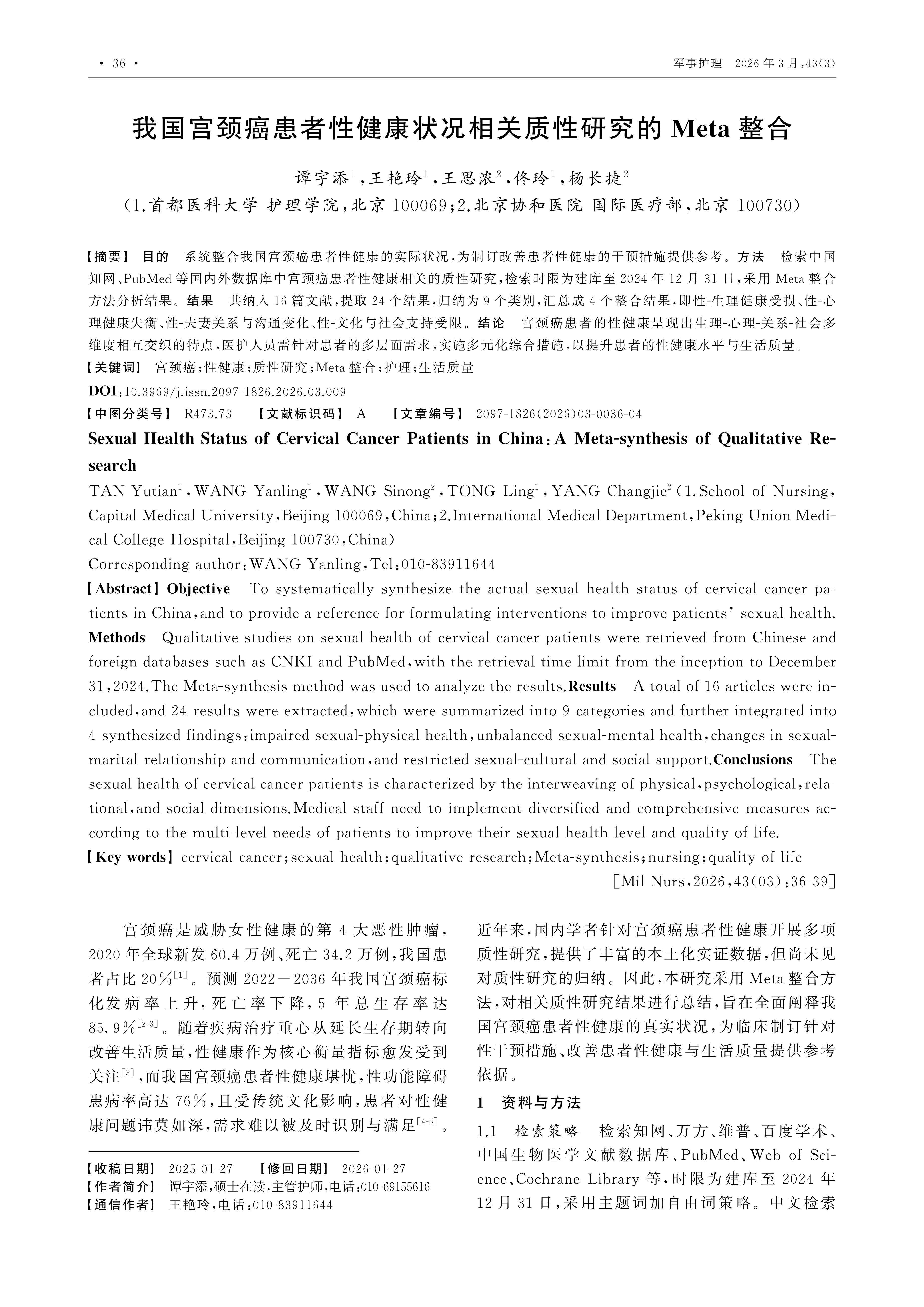 目的 系统整合我国宫颈癌患者性健康的实际状况,为制订改善患者性健康的干预措施提供参考。方法 检索中国知网、PubMed等国内外数据库中宫颈癌患者性健康相关的质性研究,检索时限为建库至2024年12月31日,采用Meta整合方法分析结果。结果 共纳入16篇文献,提取24个结果,归纳为9个类别,汇总成4个整合结果,即性-生理健康受损、性-心理健康失衡、性-夫妻关系与沟通变化、性-文化与社会支持受限。结论 宫颈癌患者的性健康呈现出生理-心理-关系-社会多维度相互交织的特点,医护人员需针对患者的多层面需求,实施多元化综合措施,以提升患者的性健康水平与生活质量。