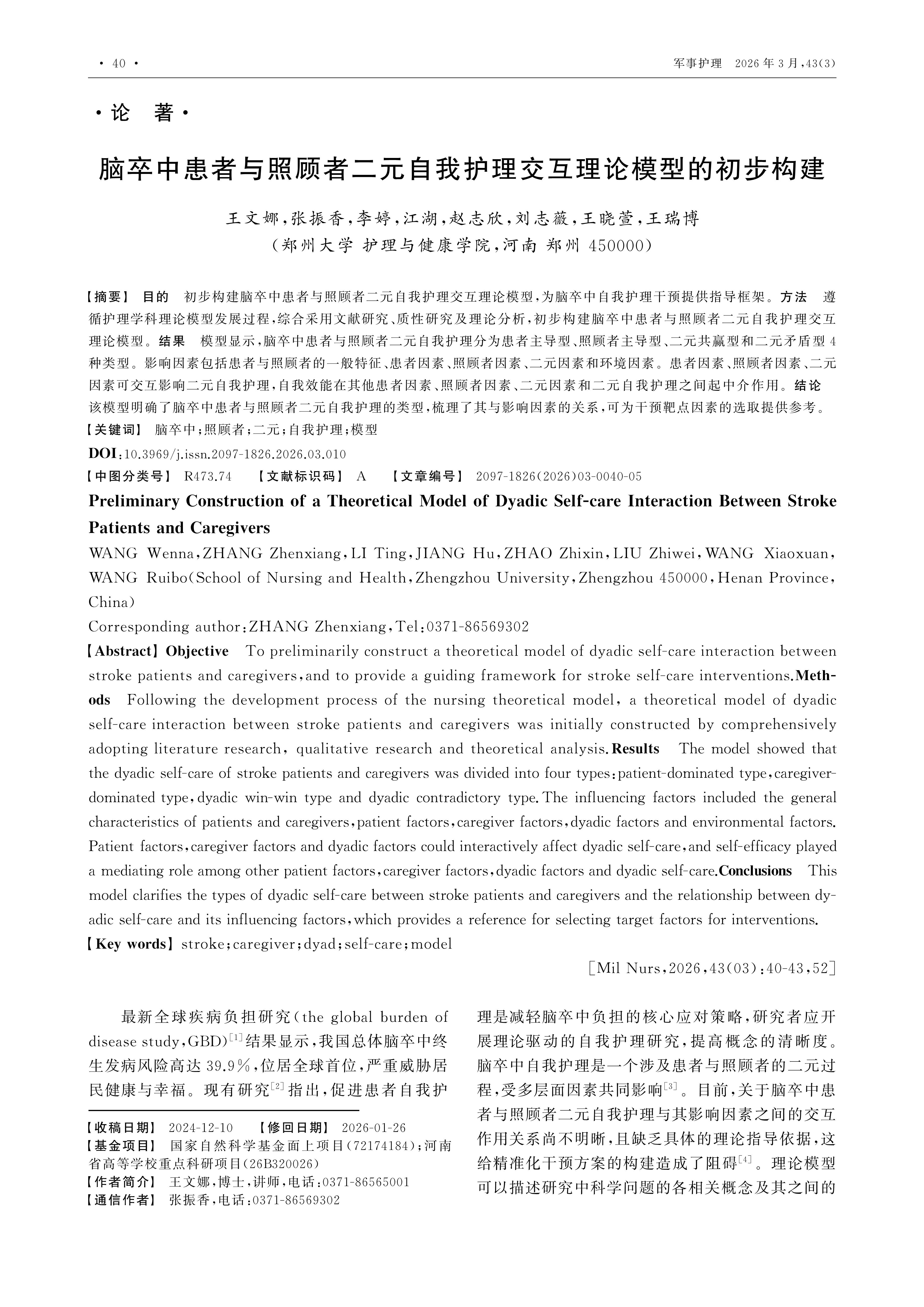 Objective To preliminarily construct a theoretical model of dyadic self-care interaction between stroke patients and caregivers,and to provide a guiding framework for stroke self-care interventions.Methods Following the development process of the nursing theoretical model, a theoretical model of dyadic self-care interaction between stroke patients and caregivers was initially constructed by comprehensively adopting literature research, qualitative research and theoretical analysis.Results The model showed that the dyadic self-care of stroke patients and caregivers was divided into four types:patient-dominated type,caregiver-dominated type,dyadic win-win type and dyadic contradictory type.The influencing factors included the general characteristics of patients and caregivers,patient factors,caregiver factors,dyadic factors and environmental factors.Patient factors,caregiver factors and dyadic factors could interactively affect dyadic self-care,and self-efficacy played a mediating role among other patient factors,caregiver factors,dyadic factors and dyadic self-care.Conclusions This model clarifies the types of dyadic self-care between stroke patients and caregivers and the relationship between dyadic self-care and its influencing factors,which provides a reference for selecting target factors for interventions.