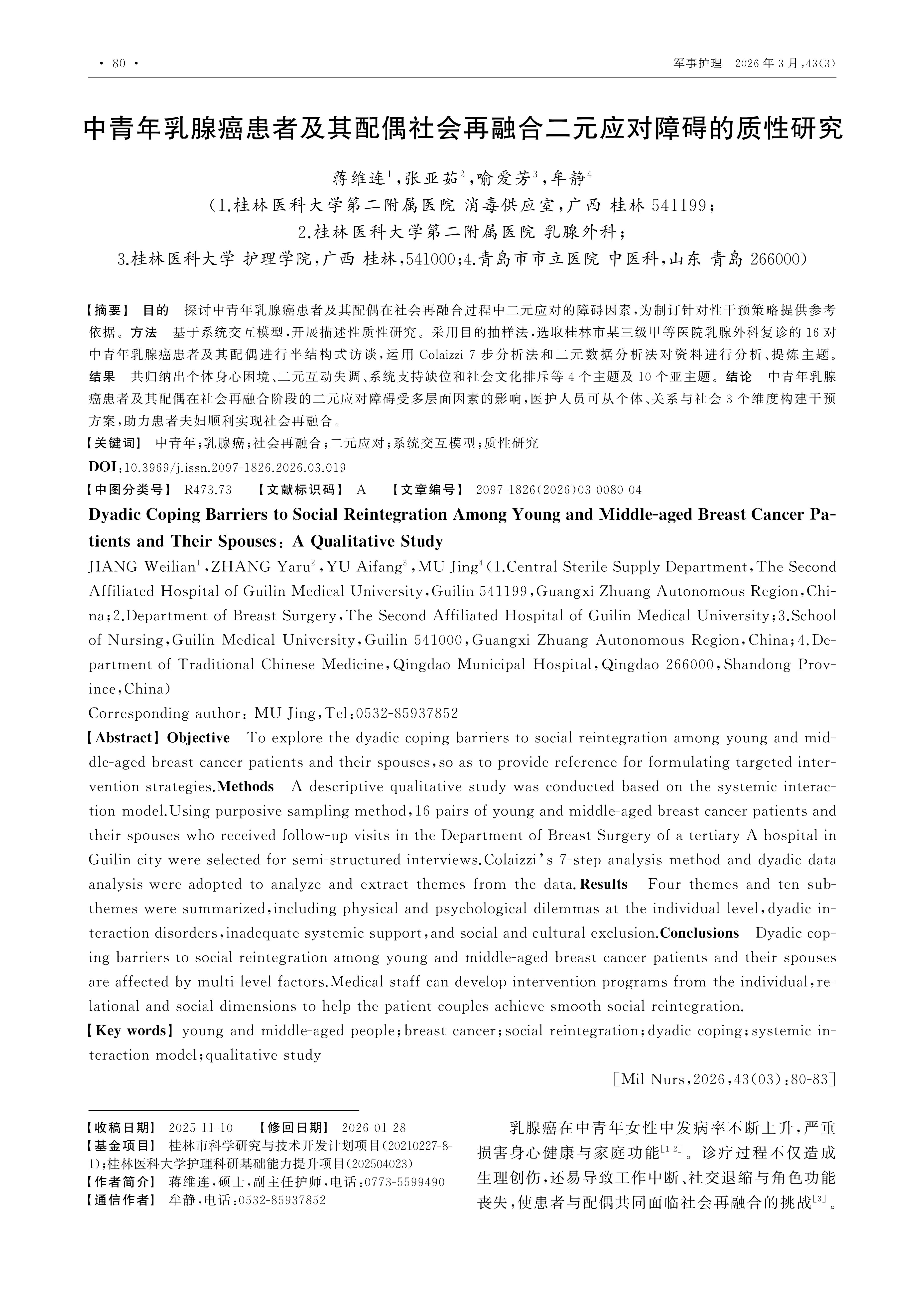 Objective To explore the dyadic coping barriers to social reintegration among young and middle-aged breast cancer patients and their spouses,so as to provide reference for formulating targeted intervention strategies.Methods A descriptive qualitative study was conducted based on the systemic interaction model.Using purposive sampling method,16 pairs of young and middle-aged breast cancer patients and their spouses who received follow-up visits in the Department of Breast Surgery of a tertiary A hospital in Guilin city were selected for semi-structured interviews.Colaizzi’s 7-step analysis method and dyadic data analysis were adopted to analyze and extract themes from the data.Results Four themes and ten sub-themes were summarized,including physical and psychological dilemmas at the individual level,dyadic interaction disorders,inadequate systemic support,and social and cultural exclusion.Conclusions Dyadic coping barriers to social reintegration among young and middle-aged breast cancer patients and their spouses are affected by multi-level factors.Medical staff can develop intervention programs from the individual,relational and social dimensions to help the patient couples achieve smooth social reintegration.