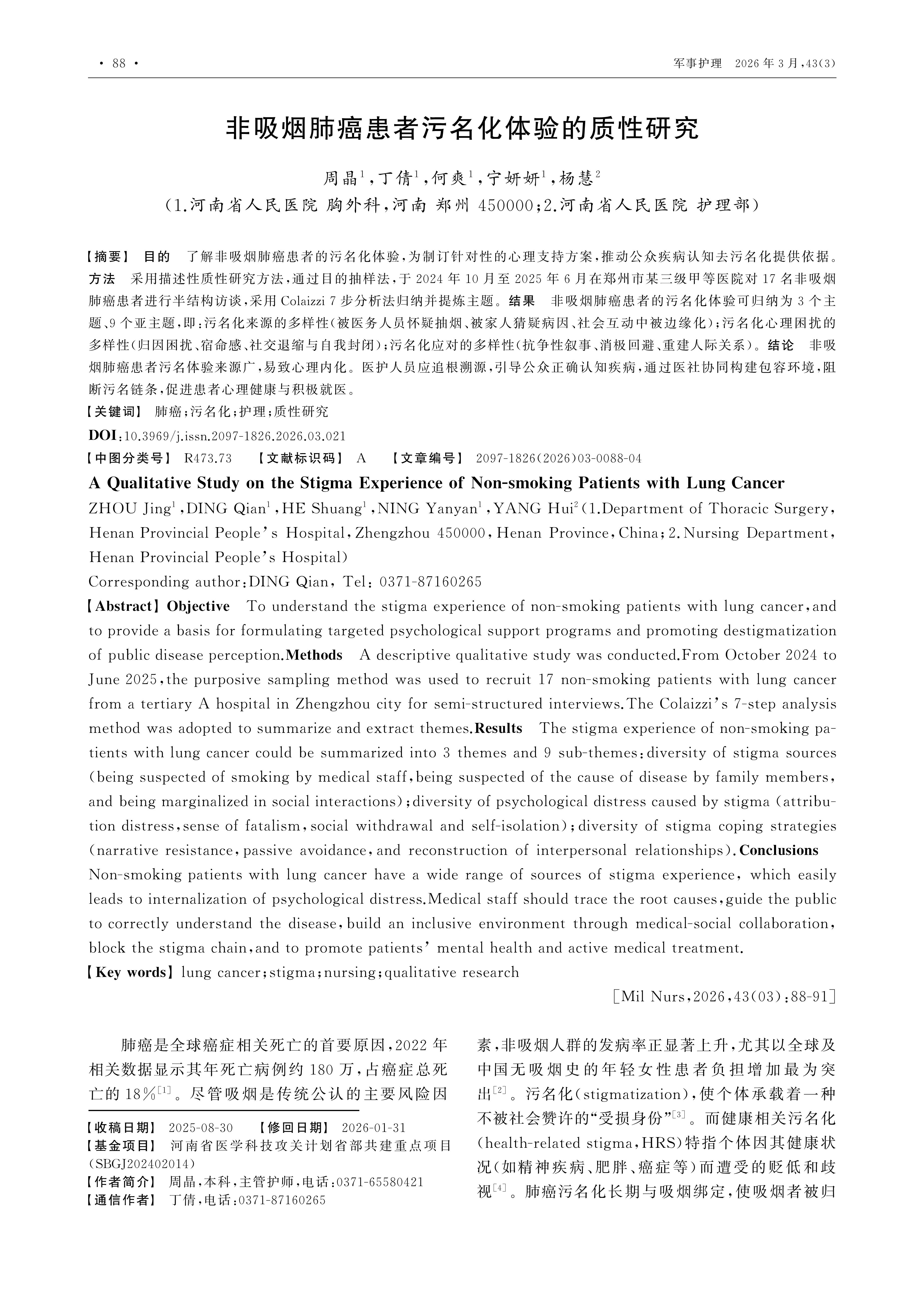 A Qualitative Study on the Stigma Experience of Non-smoking Patients with Lung Cancer